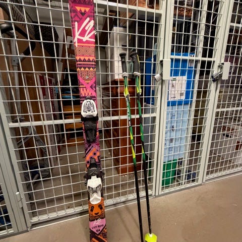 Salomon dam/ungdom. Skidorna är 155 cm, bra pistskidor för nybörjare och lätta att åka på.