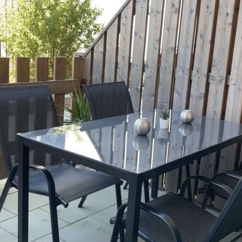 Säljer ett stilrent och modernt utebord med tillhörande 4 stolar. Nästan oanvänt och i jättefint skick, har stått på skyltad balkong.