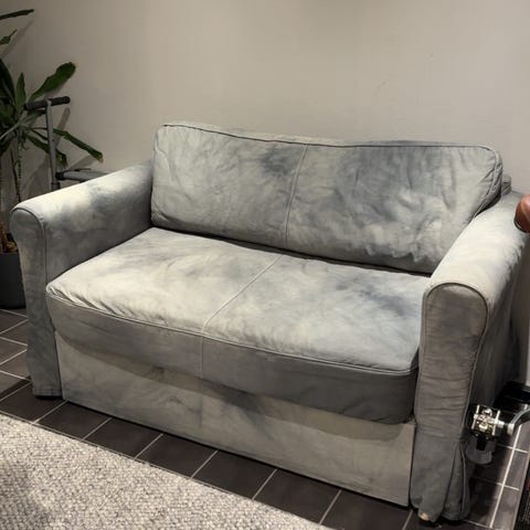 IKEA bäddsoffa med ny resårmadrass och mullvadsfärgat quiltat överdrag och två cylindriska kuddar.