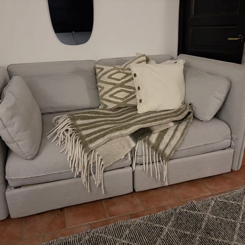 IKEA bäddsoffa med ny resårmadrass och mullvadsfärgat quiltat överdrag och två cylindriska kuddar. Bortskänkes vid hämtning