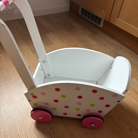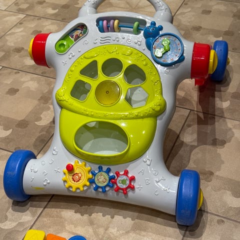 Aktivitetsvagn i trä för barn med flera funktioner inklusive klossar i olika former och färger, räknehjälpmedel med kulor och olika aktivitetsytor. Vagnen har hjul för enkel förflyttning och är utformad för att stimulera barns motorik och problemlösningsförmåga. Nypris 588 kr