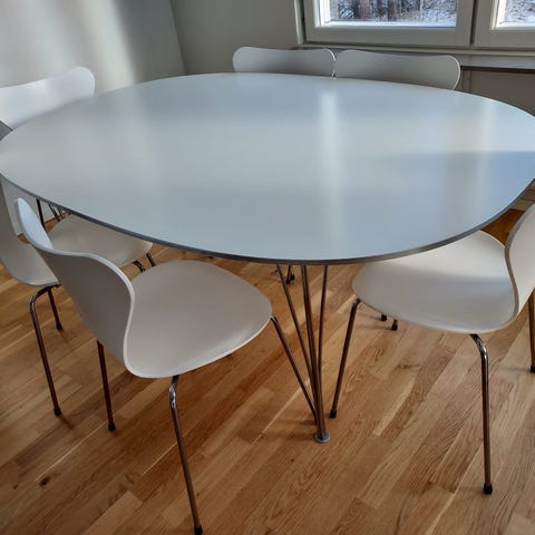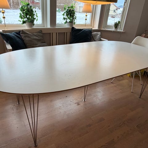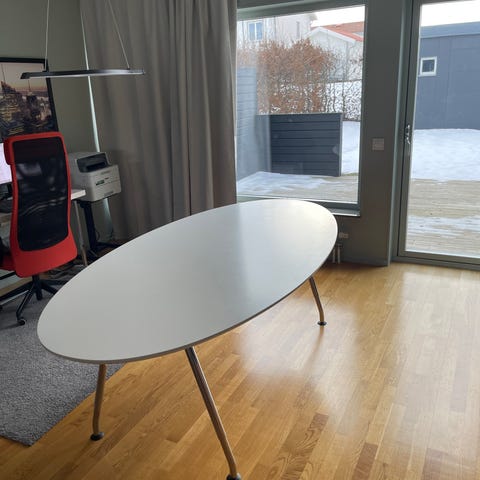 Matbord Plain från Mio 4-6 personer. Ovalt med stålben som går att flytta. Inget skav upptill men väl använt.