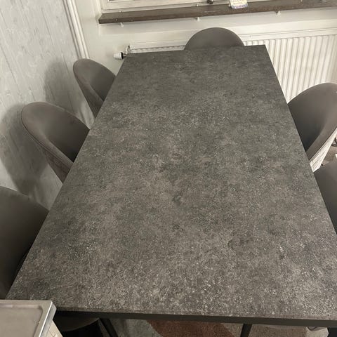 Matbordet är 140x84cm men kan bli upp till 220cm med 2 st iläggsskivor som förvaras i bordet.