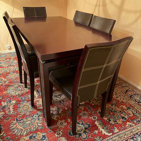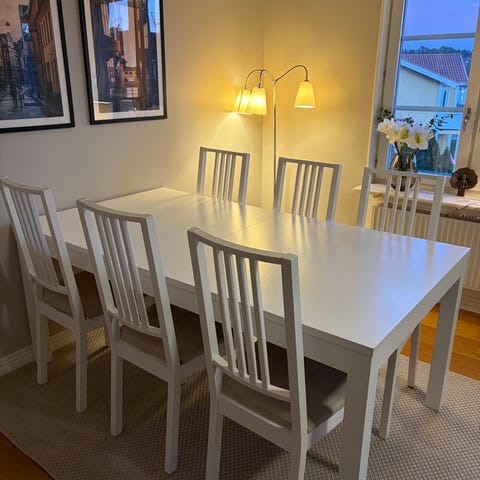 Matgrupp där bordet är i vitt trä med 6st skinnstolar.