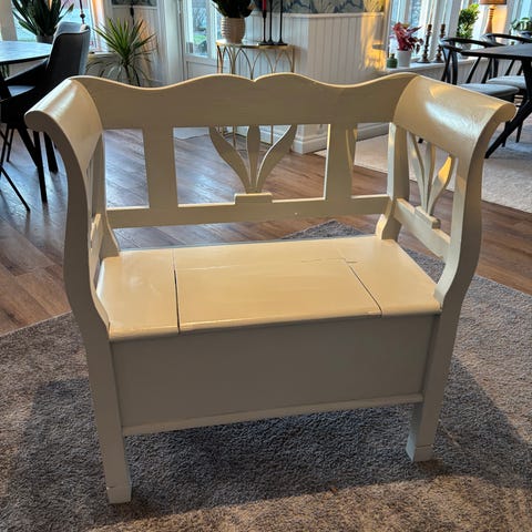 Träsoffa med ryggstöd och förvaringsutrymme under sitsen. Bord i trä med rektangulär form. Passar för vardagsrum eller matsal. Naturligt träutförande.