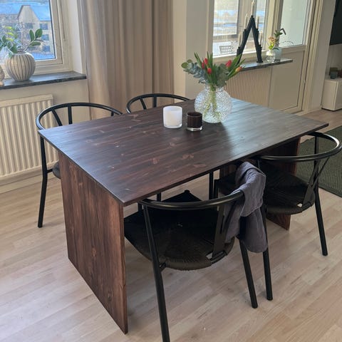 Ett rustikt matbord som är 183 cm utan förlängningsskivan och 243 cm med skivan. Bredd 110 cm och höjd 74 cm.