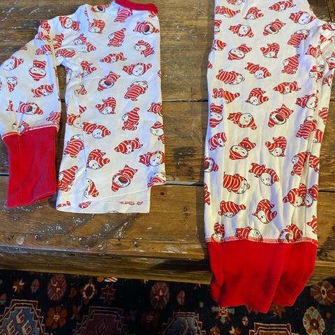 Polarn O. Pyret barnpyjamas i storlek 98-104, färg grön med vita ränder. Tillverkad i bomullsmaterial. Pyjamasen har knappar framtill och muddar vid ärmar och ben.
