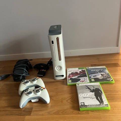 Microsoft Xbox 360 spelkonsol i svart färg. Konsolen levereras med strömadapter och anslutningskablar. Passar för användning med Xbox 360-spel och tillbehör.