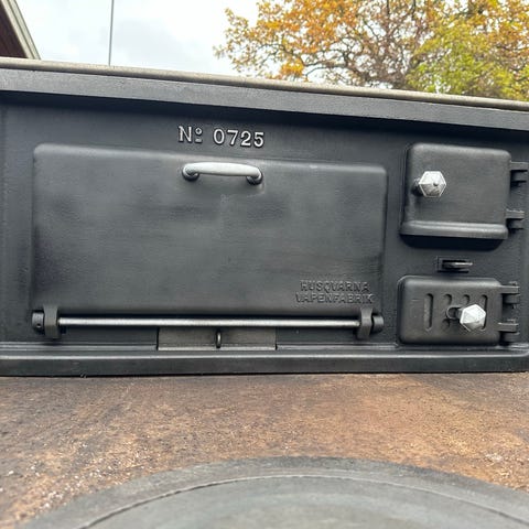 Isärplockad,blästrat,ihopmonterad med pannkitt i alla fogar,eldfast gjutmassa ovanför ugnen,nya brännjärn ,roster,nya spiral knoppar,nya dragstänger,nysvärtad och polerad