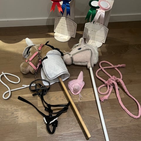 Tre käpphästar inkl tillbehör. Kommer med träns, grimmor, grimskaft, schabrak och tyglar mm