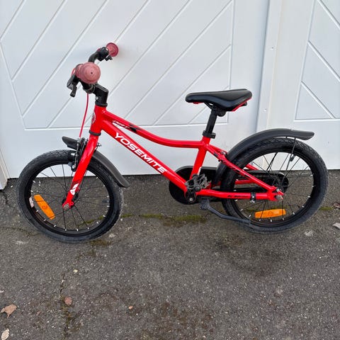 Monark barncykel med 16 tum hjulstorlek i röd färg. Cykeln har en ram anpassad för barn och är utrustad med skärmar fram och bak samt en korg framtill. Pedaler och sadel är utformade för barnets komfort och säkerhet. Reflex fram och bak samt en lyxig ringklocka med tydlig signal :)