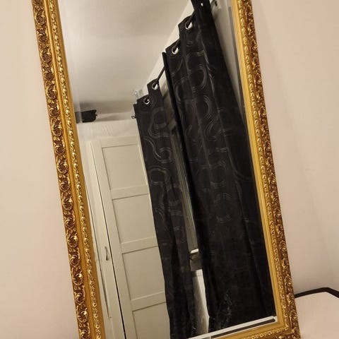 Fin helkroppsspegel med guldram. Passar i olika rum som vardagsrum, sovrum eller hall.