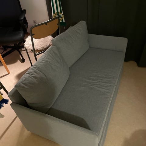 Ljusblå/grå bäddsoffa Bomsund från IKEA, med tillhörande fotpall. Fotpallen går att flytta samt har förvaringsmöjlighet. Klädseln är tvättbar.