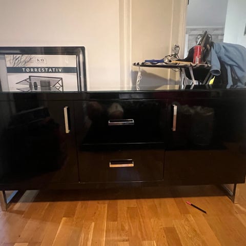 Vit vägghängd TV-möbel från ILVA. Två mindre lådor och en lucka på mitten med textil som släpper igenom signaler.