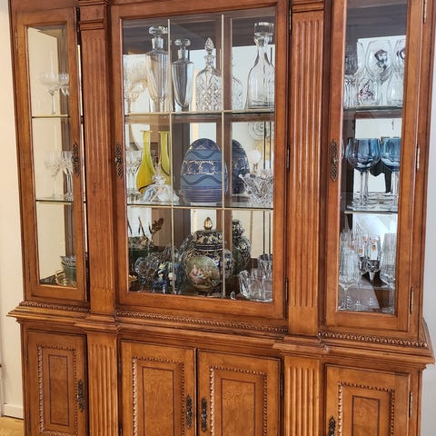 Vitrinskåp i mörkt trä med glasdörrar och korsmönster. Skåpet har flera lådor och skåpdörrar för förvaring. Passar som förvaringsmöbel i vardagsrum eller matsal.