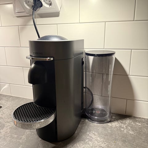 Säljer Nespresso Vertuo Next kapselkaffemaskin i stilren mattsvart färg. Maskinen är designad för att användas med stora Nespresso-kapslar och erbjuder enkel bryggning av kaffe. Kompakt och modern design som passar i köket för snabb tillredning av kaffe.