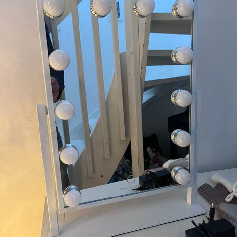 Sminkspegel med lampor runt kanten. Spegeln har en vit bas med touchknappar för att styra lamporna. Strömförsörjning sker via en ansluten sladd, finns även en USB-laddport.