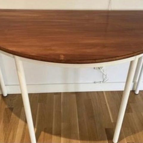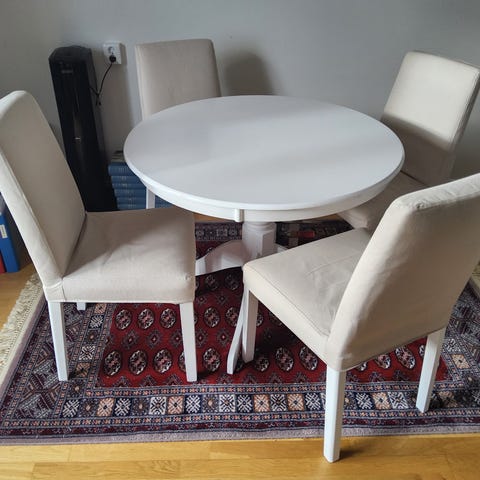 Runt bord i vit färg med fyra ben. Passar för mindre utrymmen och kan användas som sidobord eller matbord för två personer.