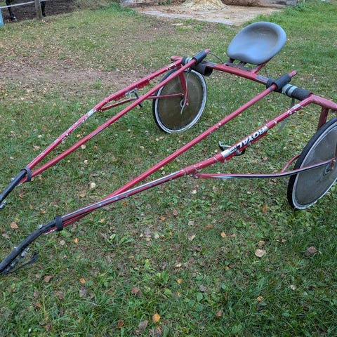 Travsulky passande Shetland och minishettis. Har dragits av vår 85cm höga ponny. Med QH-fästen. Lätt och smidig vagn som inte väger något, kanon att motionera småttingar i. Tar ingen plats vid förvaring.