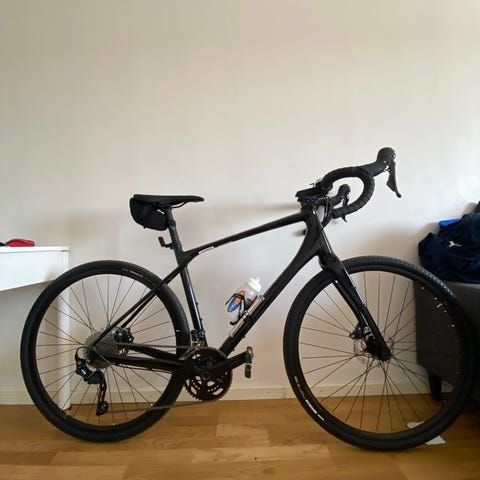 Uppgraderad med gravelhjul från en Specialized Diverge. Det sitter snabba däck för asfalt på nu men cykeln klarar upp till 40mm breda graveldäck om man vill ha det.
