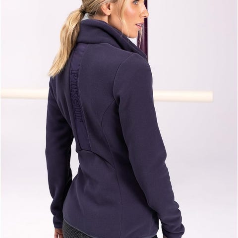 Marinblå vadderad lång ridjacka strl 150. Nedfällbara ärmslut. Tre fickor fram med dragkedja. Dragsko i nederkant, luva och ärm. Ridsprund baktill med knappar och reflex.