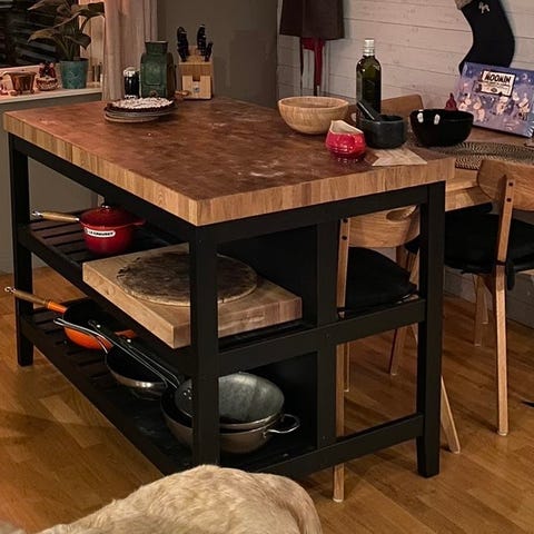 Köksö med induktionshäll och träskåp från 2001. Köksön har en grå bänkskiva och flera lådor i trä för förvaring. Passar för köksmiljöer med behov av extra arbetsyta och förvaringsutrymme.
