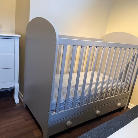 Spjälsäng med förvaringalåda. Inklusive madrass och spjälskydd