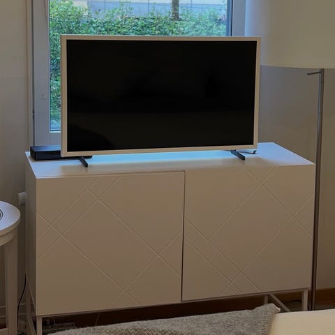 Vitt sideboard/tv-bänk från IKEA. Två skåpsluckor och en låda. Där det inte finns en låda är det ett borrat hål där vi har dragit igenom sladdar.