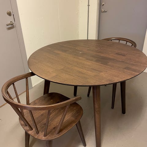 Matgrupp med 8 st stolar säljes. Bordet går att förlänga med förlängningsskiva. Originalklädseln på stolarna är den ljusa. Det blommiga mönstret på är ett extra överdrag som vi lagt på själva.