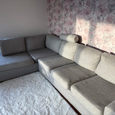Ljusgrå soffa + fåtölj (Mio) – som nya