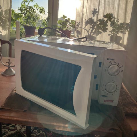 Något lägre effekt och långsammare uppvärmning än en splitterny micro men fullt fungerande och i helt OK skick. Roterande glastallrik inuti. Bredd 53cm. Höjd 28cm. Djup ca 37cm.