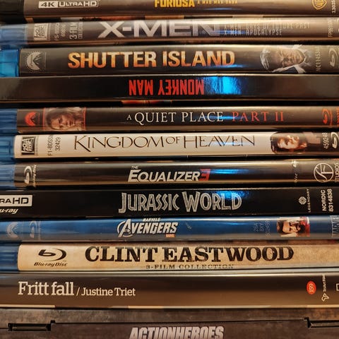 Paket med Blu-ray inklusive Trolljägaren, Avatar, Death Proof, Pulp Fiction, Looper och flera andra titlar.
