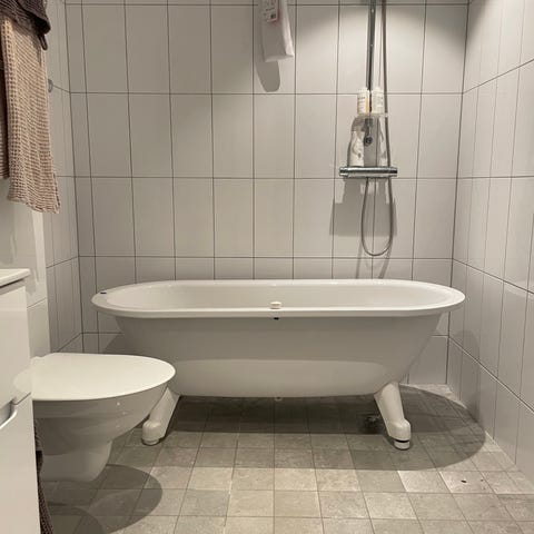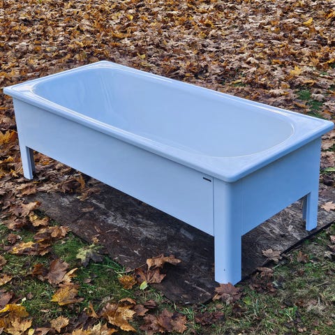 Snyggt och nätt hörnbadkar 120 x 120 cm av fabrikat Besco modell Mia. Materialet är sanitetsakryl. Våra barn har älskat detta badkar. Två små barn får plats att bada tillsammans. För en vuxen blir det ett sittbadkar. Badkaret har justerbara fötter. Slangen är mjuk vilket gör att den passar med alla golvbrunnar och ingen rörmokare behövs för installation. Täckpanelen fästs med några hakar. Allt kommer med, slang och propp.