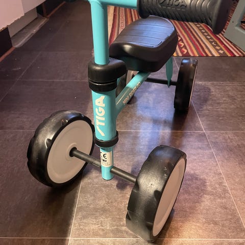 Hape springcykel tillverkad i trä med fyra hjul. Designad för små barn med fokus på stabilitet och säkerhet. Färgerna inkluderar grönt och naturligt träfärgat. Passar för inomhusbruk och hjälper till att utveckla motorik och balans.