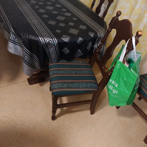 Bord + 6st svarta stolar bortskänkes i mitten av januari när vårt nya bord kommer. Lägger ut i god tid då vi behöver bli av med detta asap när de nya kommer pga platsbrist. Stolarna e lite slitna undertill men vi har stolsskydd på som är rätt nya och utan slitage som medföljer.