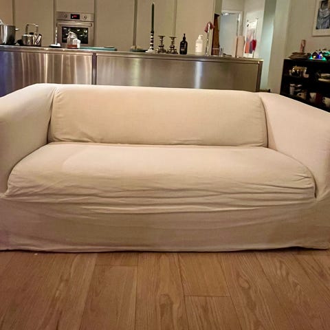 IKEA Klippan soffa. Enkel design med röda överdrag. Passar för vardagsrum och andra sittutrymmen.