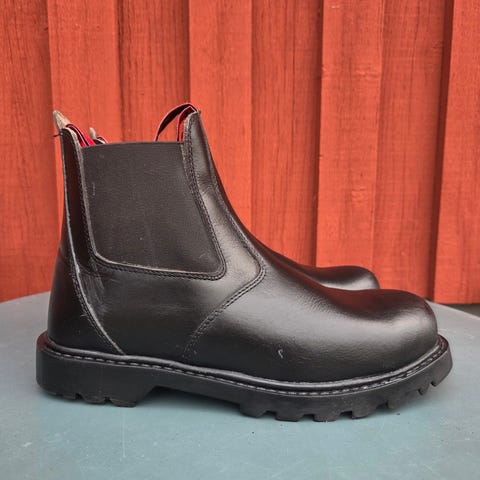 Svart lädersko i storlek 36 med slitstark sula. Skon är utrustad med stålhätta och har en elastisk insats för bättre passform.