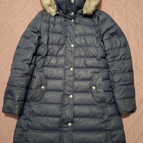 Tommy Hilfiger vinterjacka i storlek S för kvinnor. Jackan är svart och tillverkad av dunmaterial, vilket ger isolering och värme. Modellen är designad för att användas som ytterplagg under kalla förhållanden.