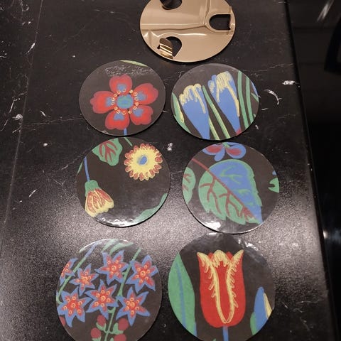 6st nya glasunderlägg som jag tapetserat med laminerad tapet Svenskt Tenn Josef Frank Paradiset svart.Laminering är livsmedelssäker,slitstark och lätt avtorkningsbar.