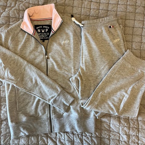 Stickat damset bestående av tröja och byxor.