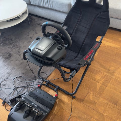 Playseat Challenge stol för racing simulator med G27 ratt, pedaler och växelspak med växelspaksfäste på stolen.