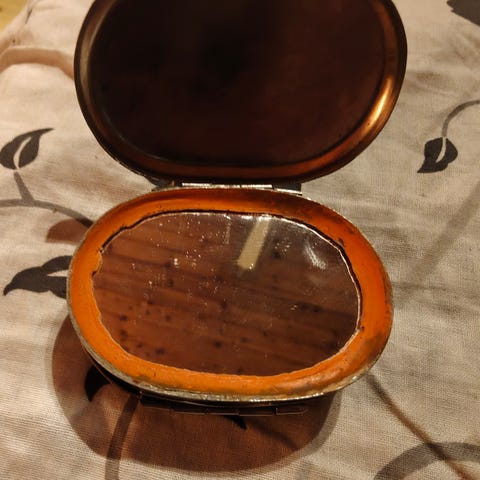 Fin liten snusdosa med två lock. Den ena med spegel. 7cm x 5cm