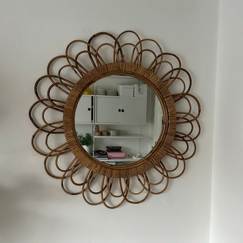 IKEA rund spegel med ram i rotting. Spegeln har en diameter på cirka 55 cm och en oval spegelyta på cirka 32 cm i bredd. Passar för väggmontering och används som dekorativ inredningsdetalj.
