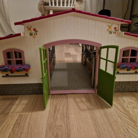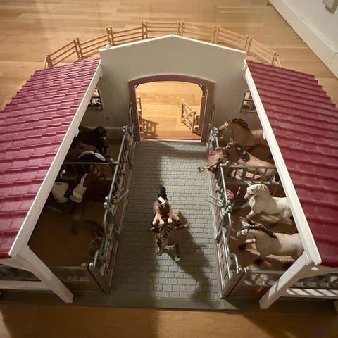 Schleich lekstall för barn inklusive flera hästfigurer och tillbehör som häststängsel och höbalar. Stallet har öppningsbara dörrar och detaljerade interiörer för lek och samling av hästar. Originalkartong medföljer. Hämtas.