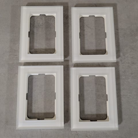 Säljer ett komplett paket med moderna elprodukter med glasramar, köpta för renovering men ej monterade. Stilren design i vitt glas, passar perfekt för modern lägenhet eller hus.