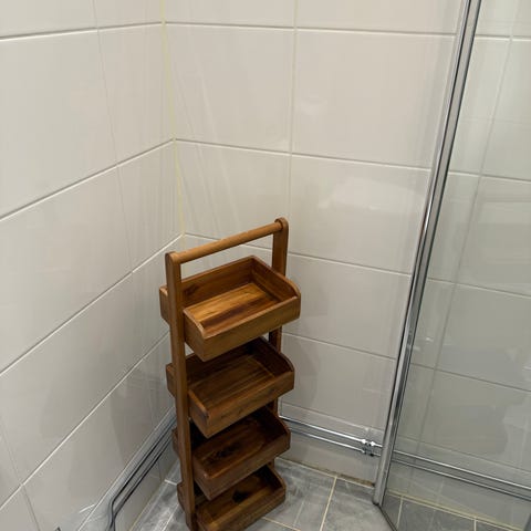 Svart hörnhylla i metall med måtten 30,5 cm i bredd och 18,5 cm i djup. Hyllan är designad för att monteras i ett hörn och har slitsar för dränering eller ventilation.