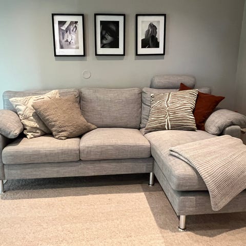 Stilren soffa med bra komfort köpt på Staland. Bekväm med lite högre rygg. Stoppning kallskum, Fast klädsel på stomme avtagbar på dynor. Mått ovan avser yttermått