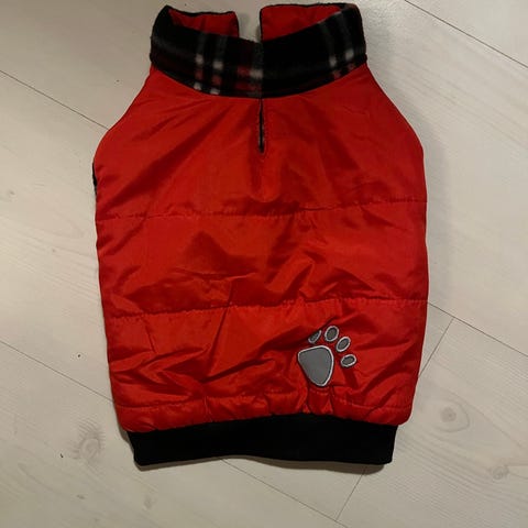 Varm jacka till liten hund. 32 cm i halsen, 45 cm över bröstkorgen, 25 cm över ryggen. Kan skickas för 20 kr.