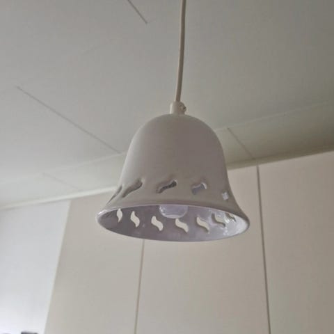 Ikea taklampa i plåt. Lampan är modifierad för att man själv ska kunna välja styrka och nyans på ljuset.