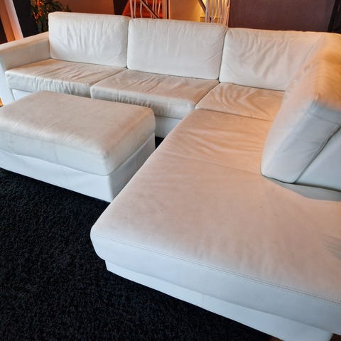 Mörkgrå hörnsoffa i skinn, mycket fint skick, nypris 20 000 kr (köpt från Trendrum). Knappt använd och väl omhändertagen. Elektrisk funktion med knappar för att fälla ut fotstöd/benstöd (recliner). Rymlig, bekväm och modern soffa.